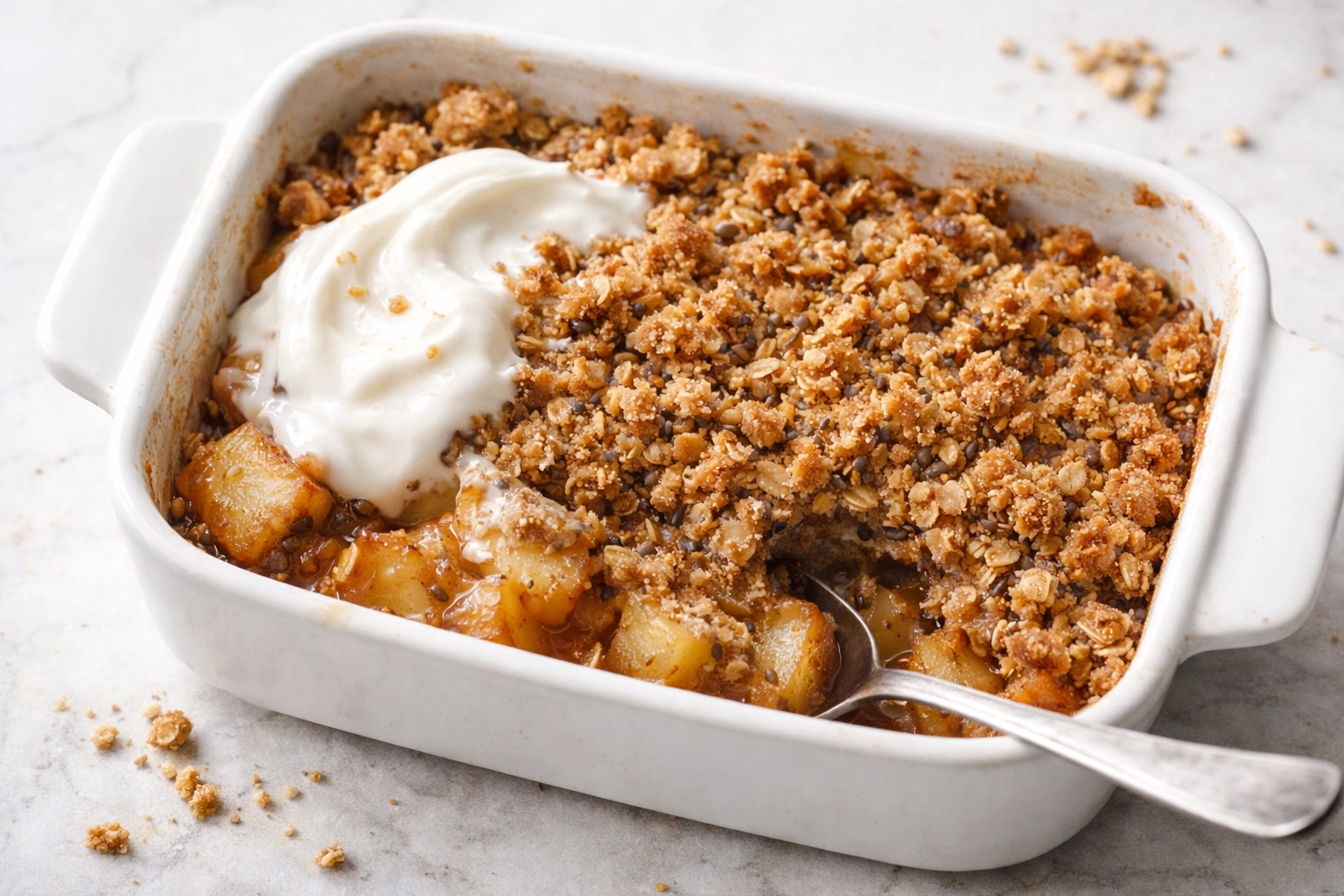 Een gezonde en smakelijke appel crumble met een crunchy topping van lijnzaad, havermout, hennep- en chiazaad, geserveerd met frisse Griekse yoghurt. Perfect als voedzaam en warm begin van de dag.