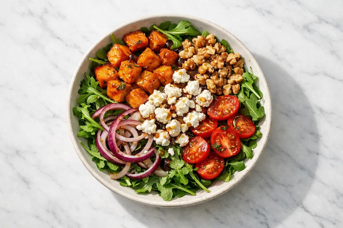 Lauwwarme salade met geroosterde zoete aardappel, romige geitenkaas, knapperige walnoten en een simpele balsamico-honing dressing – ideaal als voedzame lunch of lichte avondmaaltijd.